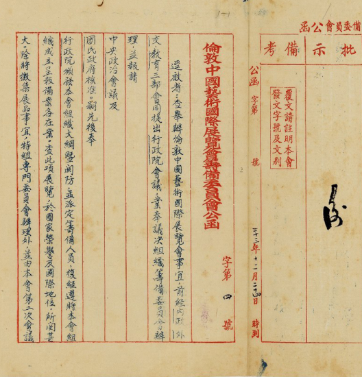 1934年12月19日,筹备委员会主任委员王世杰就行政院关于组织伦敦中国艺术国际展览会筹备委员会及选送展品等事宜致故宫博物院函。来源/故宫博物院