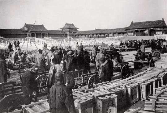 1933年3月,排子车工人正聚集在太和门广场准备装运文物木箱。来源/故宫博物院