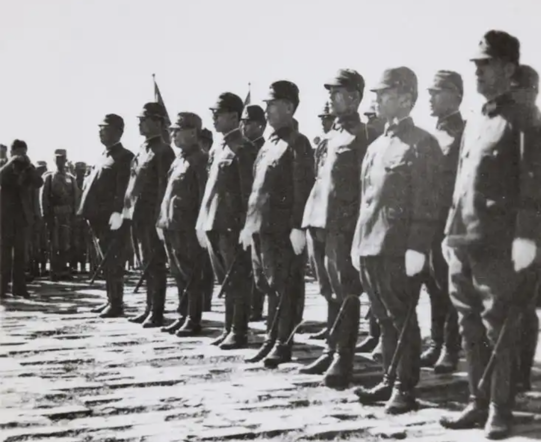 日本投降代表根本博率其他参谋人员列队等待。来源/维基百科
