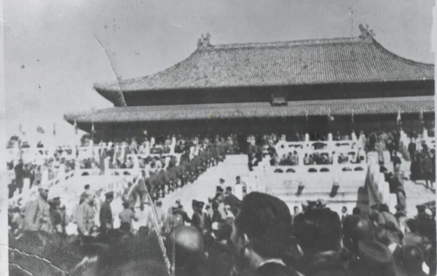 1945年10月10日,恰逢中华民国“双十国庆节”,北平秋高气爽,市民们如潮水般涌向紫禁城,20余万人挤满了太和殿广场。最初,华北受降仪式定于中南海怀仁堂室内举行,但时任中国第11战区参谋长、华北受降区北平前进指挥所主任的吕文贞在受邀观礼“天津受降”后深受触动——在公开场所受降,能让更多民众见证胜利,于是他力主将仪式改在开阔场地。选址团队曾考虑举行过明清“献俘礼”的午门,可午门广场视野受限,最终,当他们穿过太和门,太和殿前那片3万余平方米的广阔广场映入眼帘:这座紫禁城中最大、最宏伟的殿堂建于高耸的汉白玉台基之上,广场任何角落的人都能清晰目睹台上的一切,即便当时已经地砖破损、杂草丛生,其庄严气势仍无可替代。