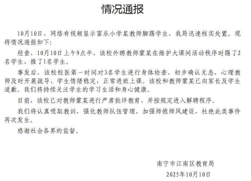 10月10日,网络有视频显示富乐小学某教师脚踢学生,我局迅速核实处置。现将情况通报如下: